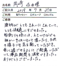 ・バーベキューが楽しかった。近くが海だったからたくさん遊べた。お魚たくさんつれて楽しかった。2階が屋根裏部屋みたいでしんせんだった。家族の思い出が増えた。ボディーボードが借りれたから海で新しいことができるようになってうれしかった。すなあそびがたのしかった。(岡崎様)